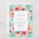 This design showcases a vibrant array of watercolor roses and ranunculus in warm pink and peach tones. Delicate teal and aqua foliage creates a refreshing contrast, providing a bright and airy aesthetic. Perfect for a sunny seasonal ceremony, the artistic botanical elements evoke a romantic and cheerful atmosphere for your special occasion.
