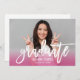 Annoncez votre diplômé dans le style en présentant leur photo senior préférée avec cette brosse blanche tendance en lettres "Graduate" avec design de superposition de dégradé rose vif. Personnalisez le libellé blanc sur le devant avec le nom de la diplômée et l'année de classe. Le dos de la carte invitations famille et amis à une fête de remise de diplômes pour célébrer l'occasion. La couleur blanche arrière - plan sur le dos peut être customisée.