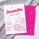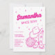 Pink Western Country Disco 16th Birthday Party Invitation features bold pink script text with personalized name, sparkling star accents, and a fun illustration of a stetson, cowboy boots, and disco ball on a white background. It’s perfect for a western or Nashville -themed birthday party. Personalize with her name, party details, and RSVP info. Let’s go girls, it’s time to celebrate!