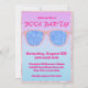 Cette invitation personnalisée présente un thème tropical de style rétro Pool Party sur un arrière - plan dégradé violet et bleu avec une police rose néon. Une image d'une paire de lunettes de soleil à parties scintillant rose est placée au centre. Les verres des verres reflètent l'eau de la piscine.