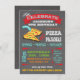 Pizza & Pyjamas Chalkboard fête d'anniversaire avec deux délicieuses tranches de pizza, des bannières et de la typographie amusante sur un arrière - plan de tableau noir. Idéal pour une fille ou un garçon ! Illustration tirée à la main par McBooboo.