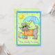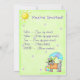 "Je suis prêt à jouer" - n’est-ce pas ? Grande invitation pour une fête de plage, une journée pour les animaux dans le parc et bien plus encore. Ce chien est prêt à s’amuser à la plage avec un ballon de plage et un parapluie. Avec des lunettes de soleil cool, des tongs fuchsia et turquoise, un tee - shirt de plage orange et un casquette de plage violet, il est prêt à partir, habillé en style. L'arrière - plan est vert avec des étoiles violettes et une bordure bleue. Le soleil brille pour une journée parfaite et il est prêt pour vous à lancer le ballon. Le texte en bas dit "Je suis prêt à jouer".