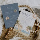 Apportez une ambiance côtière décontractée à votre baby shower avec cette invitation à deux côtés "Baby on Board" de Redwood & Vine Design Co. L'avant présente des oeuvres peintes à la main de palmiers, des vagues océaniques, des rives de sable, du soleil doré et des planches de surf, tandis que l'arrière comporte un arrière - plan bleu coordonné avec des illustrations tropicales, des détails de registre cadeaux et un code QR scannable pour un accès facile registres en ligne. Idéale pour une fête tropicale, sur la plage ou inspirée du surf, cette invitation associe beauté naturelle et détails pratiques pour une présentation complète et élégante.