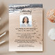 Une belle invitation de célébration de la vie pour quelqu'un qui aimait l'océan et marcher le long de la plage. Le devant présente une photo de fond d'une plage paisible avec des empreintes de pas dans le sable. (Vous pouvez remplacer la photo de fond par l'une des vôtres) Ajoutez facilement une photo de votre proche et les détails de votre célébration. Le verso offre un espace pour une photo et un poème ou une écriture (ou supprimez). Le modèle est très facile à utiliser et à modifier - créez une invitation unique et belle qui sera chérie pour toujours.