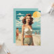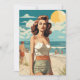 L'image est une affiche pop art vibrante représentant une scène de plage des années 1950. Une femme confiante aux cheveux volumineux ondulés, vêtue d'un costume de bain blanc et orange élégant, est au premier plan. En arrière - plan, les autres baigneurs profitent de diverses activités le long du rivage, avec un soleil éclatant dans un ciel bleu parsemé de nuages. L'esthétique générale allie mode rétro et ambiance animée et nostalgique.