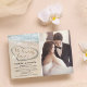 Invitation de célébration de notre fuite featuring le rivage de l'océan bleu, un cœur sculpté dans le sable, une photo du couple heureux et un modèle de mariage juste mariés facile à personnaliser.