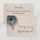 Demandez-lui d'être votre demoiselle d'honneur avec cette belle carte d'invitation personnalisée. Une plume de paon bleue, beige et verte tourbillonne autour du coin supérieur gauche, et votre texte personnalisé est en brun en bas à droite. Les images et le texte sont placés sur un fond gris clair beige en détresse qui complète les couleurs des plumes. Le dos de l'invitation a un fond assorti, mais sans les plumes, et des champs de texte pour personnaliser l'invitation. Distinctif et exquis ! Assurez-vous de voir les produits de mariage assortis dans notre magasin.
