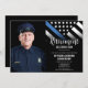Cette conception comprend un drapeau de la police avec des rayures noires et blanches, ainsi qu'une fine bande bleue. L'insigne de police et le texte en or sont au-dessus de tous les détails du parti pour l'officier de l'application de la loi, le shérif, le capitaine ou les chefs du parti de retraite qui prend sa retraite. Customisez cette conception encore plus loin avec la photo de l'officier de police à la retraite.