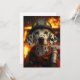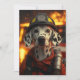 Un chien dalmate courageux vêtu comme pompier, devant une scène brûlante avec des étincelles qui volent. Le chien porte un casque de feu et un équipement de protection, symbolisant courage et héroïsme.