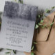 Élégante invitation à la cérémonie commémorative, avec une photo d'un pont en hiver avec des arbres enneigés. L'arrière a un arrière - plan en marbre.
