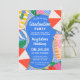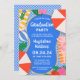 Invitation à la fête de remise de diplômes du lycée colorée, moderne et tendance. Les détails de la fête sont écrits sur l'eau bleue de la piscine en blanc. La vue aérienne montre les femmes bronzant au bord de la piscine, des parapluies rouges et blancs, des boules de plage, des fleurs tropicales et des feuilles de palmiers. Carrelage bleu et blanc fournit l'arrière - plan. Cet article fait partie de la collection Graduation Pool Party.