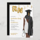 Portrait Infirmière école de sciences infirmières Invitation de la fête de graduation. African American Nurse Invitation pour votre fille, nièce, mère, tante, cousin ou ami qui est diplômé de l'école de soins infirmiers et est maintenant officiellement infirmière. Invitation pour les grandes fêtes célébrant les femmes qui viennent d'obtenir leur diplôme de l'école de soins infirmiers. Célébrez la nouvelle infirmière autorisée avec cette élégante invitation de graduation en soins infirmiers! Portrait d'une femme à la peau foncée aux cheveux longs ondulés arrachés dans une queue de cheval. L'infirmière grad porte une robe blanche élégante, une robe noire de graduation drapée sur son épaule et une casquette noire assortie. Elle tient des ballons de style feuille d'or avec les lettres RN d'une main et un stéthoscope de l'autre. Accentée de confettis dorés chatoyants, elle saisit parfaitement la joie et l'excitation de sa grande réussite.