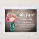 Cette carte d'invitation de réception de fuite amoureuse avec pot de fleurs en verre rustique est parfaite pour une fête de fuite amoureuse sur le thème floral country. Le design présente une élégante composition de pivoines et de fleurs sauvages en aquarelle rose pâle dans un pot en verre bleu sur un fond texturé en bois. Les cartes RSVP sont vendues séparément.