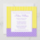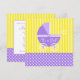Une jolie poussette est présentée sur cette invitation à baby shower de fille violet et jaune.