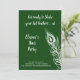 Une grande plume de paon décore cette invitation à l'enterrement de vie de jeune fille sur fond vert émeraude avec la phrase mignonne, Préparez-vous à secouer vos plumes de paon ! ce qui la rend parfaite pour une soirée en ville à danser pour célébrer la mariée.