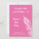 Une grande plume de paon blanche décore cette invitation à une soirée de poulettes sur fond rose avec la jolie phrase, Préparez-vous à secouer vos plumes de la queue ! ce qui la rend parfaite pour une soirée en ville à danser pour célébrer la mariée.