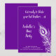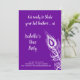 Une grande plume de paon décore cette invitation à la fête de la future mariée sur fond violet avec la phrase mignonne, Préparez-vous à remuer vos plumes ! ce qui la rend parfaite pour une soirée en ville à danser pour célébrer la mariée.