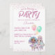 Cette invitation personnalisée à la fête présente un thème girly et glamour. Deux jolies poupées de fille de parties scintillant sont placées en bas à droite, avec trois ballons de fête d'anniversaire. Chaque poupée a des cheveux colorés, une tenue mignonne, et de grands yeux adorables. Les confettis de parties scintillant rose accentuent les parties supérieure et inférieure.