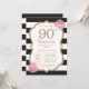 Invitation pour 90e anniversaire surprise. Rose, noir et or. Paillettes dorées. Rayures noires et blanches. Fleur rose florale. Anniversaire adulte. Fête d'anniversaire pour femmes. Pour une personnalisation plus poussée, veuillez cliquer sur le bouton "Personnaliser" et utiliser notre outil de conception pour modifier ce modèle.