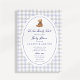 Cette charmante invitation à une baby shower présente un ours en peluche aquarellé mignon associé à un fond gingham bleu clair pour un look classique et chic. Le titre ludique « Nous pouvons à peine attendre » ajoute une touche mignonne et mémorable parfaite pour célébrer l'arrivée d'un nouveau bébé. Le cadre ovale élégant garde le design intemporel et raffiné, ce qui en fait l'idéal pour une baby shower pour garçon ou une célébration sur le thème de l'ours en peluche. Personnalisez avec les noms, la date, le lieu et les détails de RSVP pour créer une belle invitation personnalisée pour une baby shower.