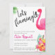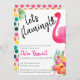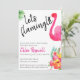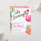 Arrangement floral tropical vibrant et flamant rose aquarelle avec motif à points estivaux en arrière-plan, invitation à un baby shower. Personnalisez le texte, le style de police, la couleur et la taille.
