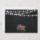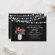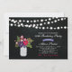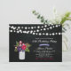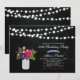 Célébrez votre jour spécial avec cette invitation d'anniversaire élégante. Ce design présente des guirlandes lumineuses, un pot Mason et un bouquet de fleurs sur un fond de tableau noir.