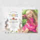 Cartes d'invitation pour la 3e fête d'anniversaire avec une jolie ferme et animaux de compagnie, avec un fond blanc simple, une photo de votre bébé, des animaux de ferme adorables, y compris une vache, une chèvre, un cochon, un mouton, un âne, un cheval, un lapin, un canard et un coq, et un modèle de célébration d'anniversaire pour enfants facile à personnaliser.