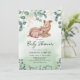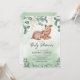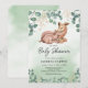 Cartes d'invitation neutres pour une baby shower sur le thème des animaux, avec une maman et un bébé cerf en aquarelle, de la verdure d'eucalyptus, des fleurs dorées et un modèle élégant facile à personnaliser.