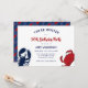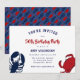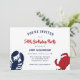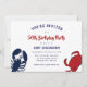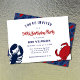 Cartes d'invitation pour une fête d'anniversaire sur le thème des homards et des crabes en rouge, blanc et bleu. Personnalisez pour tout type de fête liée à la mer avec du texte bleu marine sur fond blanc. Le titre/type de fête est en rouge foncé. Un design de homard bleu et de crabe rouge sur le devant avec un motif de crustacés au verso.