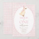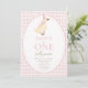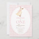 Modifiez le texte pour personnaliser cette invitation de fête d'anniversaire amusante et douce. Parfait pour un thème ONE Silly Goose pour un premier anniversaire. Caractéristiques un motif gingham rose, une oie avec un chapeau de fête d'anniversaire rose et une typographie amusante.