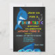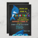 Fête d'anniversaire SHARKTASTIC. Cette invitation a un arrière - plan noir en tableau noir avec un grand requin bleu. Au centre inférieur de cet invitation il y a une queue de requin qui sort des vagues rugissantes. Personnalisez cette invitation avec vos informations de fête dans des polices lumineuses et amusantes. Découvrez les autres designs et produits de cette collection dans notre boutique.