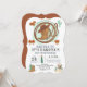 Une invitation de premier anniversaire "saddle up" mignonne et fantaisiste cowboy sauvage ouest en terre cuite bruns et verts pour un garçon, avec équipement western cowboy et animaux de ranch. Selle, pilon, chevaux, cactus, selle et lasso. Tout comme cowboy a besoin. C'est son premier rodéo ! L'arrière de l'invitation a un effet patiné clair en bois de grange. Vous pouvez customiser ceci pour l'âge de n'importe quel enfant.