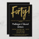 Une élégante, simple mais saisissante invitation de 40e anniversaire de mariage noir et or. Texte de script glamour en haut et texte doré en bas avec le nom en blanc qui ressort