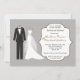 Cette invitation moderne présente un smoking noir et une robe mariage de mariée blanche sur un arrière - plan gris clair. Vous pouvez utiliser ce invitation pour des annonces mariages, des invitations à des fêtes de fiançailles, pour sauvegarder la date, des dîners de répétition ou des invitations à des déjeuners mariages.