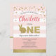 Invitation pour la fête de 1 an de bébé fille thème lapin rose et or chic et moderne avec des rayures roses et blanches.