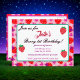 Célébrez le jour spécial de votre petit bout avec cette adorable carte d'invitation de premier anniversaire sur le thème de la fraise ! Avec un charmant design rose et rouge mettant en vedette des fraises et des cœurs mignons, cette carte est parfaite pour inviter vos amis et votre famille à la célébration sucrée de votre enfant. Personnalisez-la avec le nom de votre enfant et les détails de la fête pour la rendre encore plus spéciale. Les couleurs vives et le design ludique raviront à coup sûr vos invités et feront une impression durable. Cette carte de haute qualité garantit que votre invitation se démarque. Commandez la vôtre dès aujourd'hui et rendez le premier anniversaire de votre fille inoubliable !