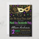 Génial et amusant, cette invitation de FÊTE MARDI GRAS / MARDI GRAS / NOUVELLE-ORLÉANS / MASQUERADE est idéale pour un enterrement de vie de jeune fille inoubliable ! L'invitation présente un masque de masquerade en faux or et des confettis en faux brillants sur fond noir.