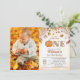 Invitation photo pour le 1er anniversaire avec citrouille pailletée et feuilles tombantes rustiques