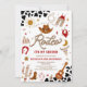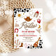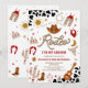 Mettez-vous en selle pour une célébration amusante avec cette invitation pour un 2ème anniversaire sur le thème du rodéo western ! Avec des motifs de cow-boy ludiques comme des chapeaux, des bottes, des lassos, des cactus et des crânes de bœufs sur un fond audacieux à motif de vache, ce design capture parfaitement l'esprit de la grande journée d'un petit cow-boy. Idéal pour les fêtes d'anniversaire des enfants, il donne le ton pour un événement animé plein d'aventure et de charme. Personnalisez facilement avec les détails de votre fête pour le rendre vraiment unique.