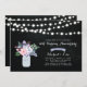 Une invitation d'anniversaire de mariage rustique élégante avec un pot mason et un bouquet de fleurs sur fond de tableau noir.