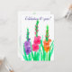 Une invitation de mariage floral décorée de trois fleurs de gladiolus vibrantes en pourpre, rose et orange avec des feuilles vertes brillantes peintes à l'aquarelle. Dans le langage des fleurs, le gladiolus signifie "tu me perces le cœur" et force de caractère. C'est aussi la fleur traditionnelle du 40e anniversaire de mariage.