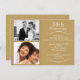 Cette invitation pour les 50 ans d'anniversaire de mariage dorés présente un motif damassé embossé sur une partie du design et dispose d'espace pour deux photographies. Le design comprend également deux motifs fleuris blancs au-dessus et en dessous de la zone de texte. Le dos de l'invitation présente à nouveau le motif damassé. Cette invitation convient pour un 50e anniversaire de mariage doré.
