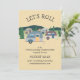 Invitation pour camping-car teardrop sur fond papier artisanal aux nuances de bleu et de marron. Personnalisez avec votre propre texte !