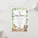 Conception de baby shower pour garçon ou fille sur le thème des animaux de la forêt, avec un cadre de feuilles botaniques et un hibou, un ours, un renard, un castor, un raton laveur, un cerf et un lapin. Retournez notre design pour voir l'arrière assorti avec des feuilles pour un effet spécial.