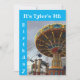 Image d'un manège de balançoires dans un parc d'attractions sur le devant. Détails de la fête au dos.