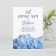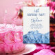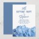Invitation pour une fête d'anniversaire avec des hortensias bleus. De jolies fleurs bleues claires forment une large bordure au bas de cartes en forme de support. Style de police élégant avec des modèles faciles à utiliser. Convient à toutes les occasions pour honorer une femme charmante.