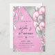 Invitation pour une fête d'anniversaire rose et argent avec des ballons et des rubans scintillants et brillants.
