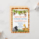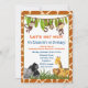 Une invitation à une fête d'anniversaire avec un thème safari cool. Le fond est un motif de peau de girafe. Conçu avec une bannière de feuilles de jungle en haut et des singes espiègles pendus à l'envers. Un hippopotame, un gorille, un lion et une girafe se détendent en bas dans quelques herbes de la savane. Personnalisez avec les détails de votre fête.