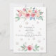 Une belle et élégante invitation personnalisable pour une fête sur le thème des perles et du prosecco, avec des lettres en faux or rose, des perles et des roses.