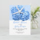 Invitation à une fête de mariage avec grande hortensia bleu et motif d'étoile de mer. Faisant partie de la collection « Jardin au bord de la mer », cette papeterie présente la fleur bleue réaliste et l'étoile de mer en haut et le texte en bas. Conçu pour une fête de mariage, mais convient également pour une fête de mariage pour le couple. Remplissez d'abord la fête / occasion avec le nom, ou les noms en écriture manuscrite. La date de la fête, le lieu et l'heure sont imprimés en noir. Le verso est bleu uni. Choisissez une mise à niveau de papier pour créer un souvenir inoubliable et magnifique.